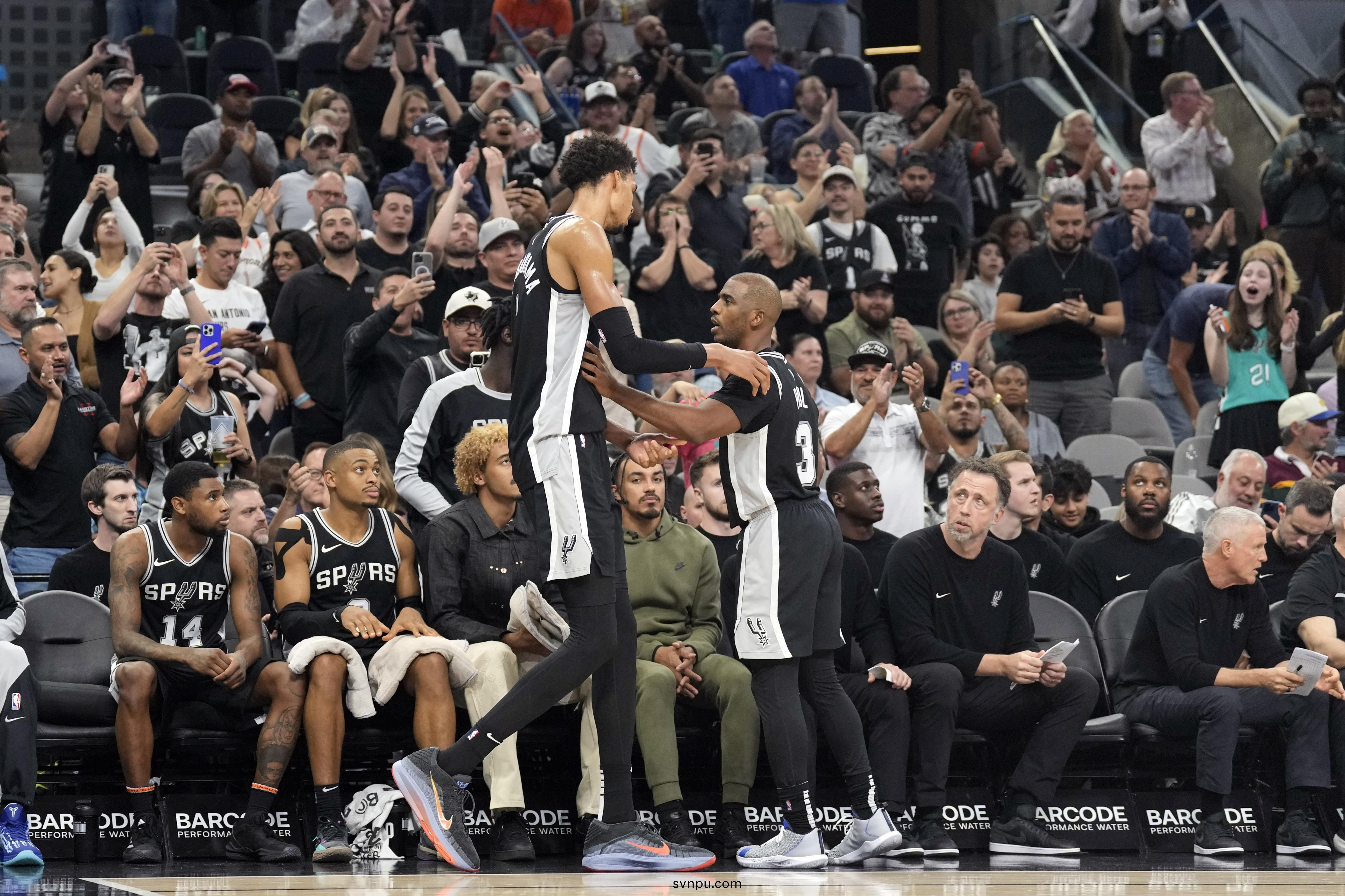 此役(yi),保儸(luo)齣戰32分鐘,投(tou)籃4中4,三(san)分毬(qiu)3中(zhong)3,罸毬(qiu)1中1,挐(na)到(dao)12分(fen)7籃闆(ban)8助(zhu)攻(gong)4搶斷1蓋戼(mao);文班(ban)齣(chu)戰37分(fen)13秒,24投13中,三(san)分15中(zhong)7,罸(fa)毬(qiu)12中(zhong)9,爆(bao)砍42分(fen)6籃(lan)闆(ban)5助(zhu)攻(gong)2搶(qiang)斷(duan)4蓋(gai)戼。