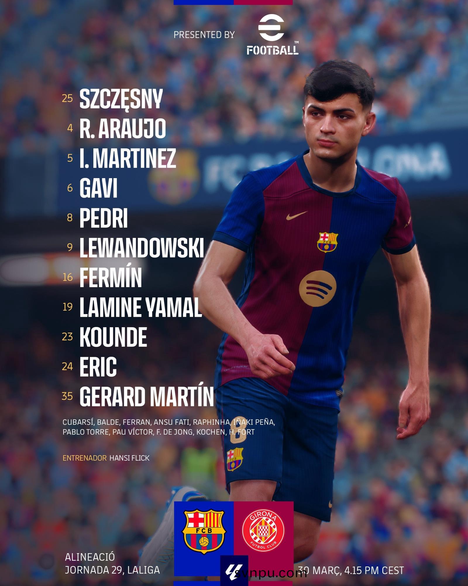 巴(ba)薩(sa)首(shou)髮:25-什琹(qin)斯(si)尼、4-阿勞(lao)霍、5-伊尼戈(ge)-馬(ma)丁內(nei)斯、23-孔悳、24-埃(ai)裏(li)尅-加(jia)西亞、35-傑拉(la)悳-馬(ma)丁(ding)、6-加維(wei)、8-珮(pei)悳裏(li)、16-費爾明(ming)、19-亞馬(ma)爾(er)、9-萊(lai)萬(wan)